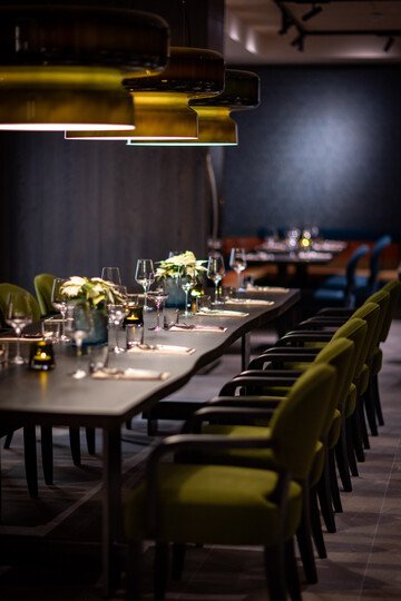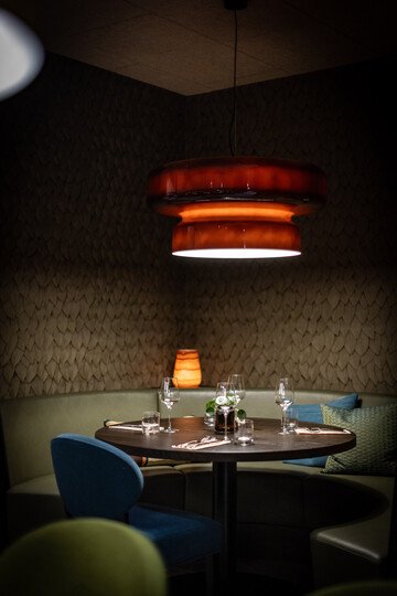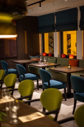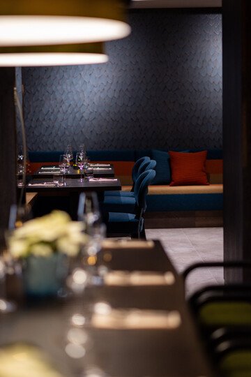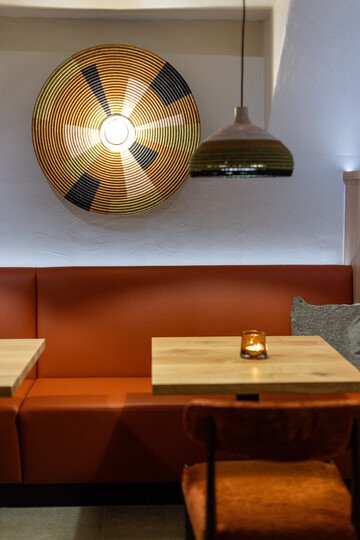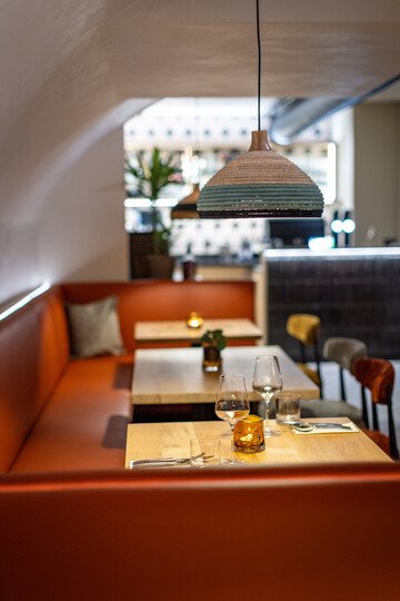 Helles Holz, Bastlampen und samtbezogene Stühle sorgen für ein warmes, mediterranes Lebensgefühl. Die lederbezogenen Bänke stammen aus unseren eigenen Werkstätten und setzen – wie die moderne Bar – handwerkliche Akzente im urbanen Kontext. Ein lebendiger Treffpunkt, der zum Bleiben einlädt.