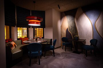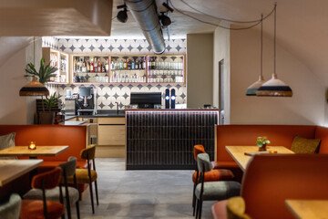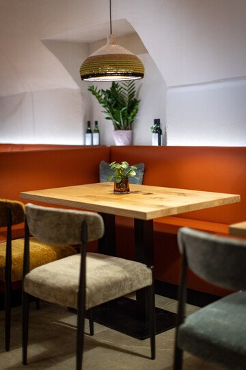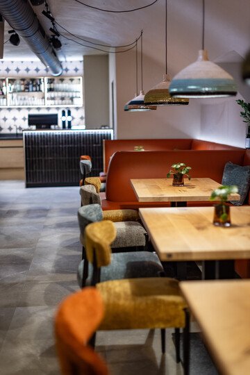 Das Bistro im Erdgeschoss öffnet sich zur Kirchengasse – mit Außensitzplätzen mitten im historischen Zentrum. Das Herzstück: ein charmantes Gewölbe, farblich inszeniert mit erdigen Rottönen, Ockergelb und gedecktem Blau.